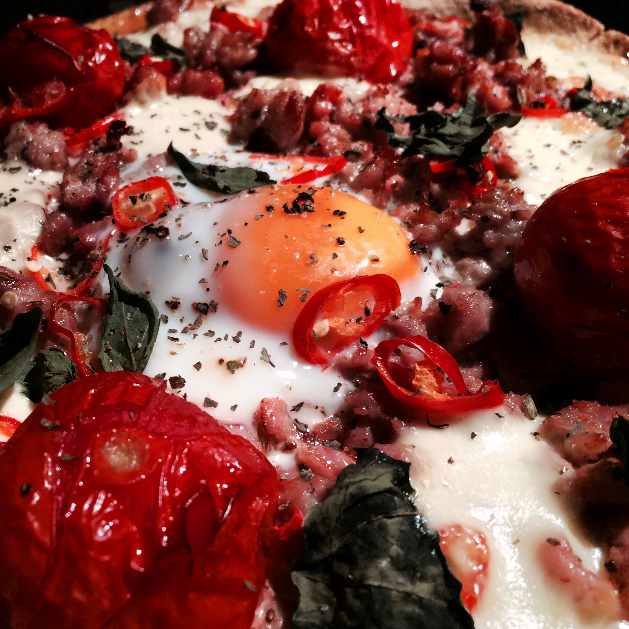Inspired by a day of meeting wonderfully creative women and making new Instagram friends at the WKA lunch shoot, I spent the weekend trying to recreate some of Katie’s recipes, namely her fantastic Italian sausage, bacon, roasted tomato and egg pizza, which quite frankly, was an absolute REVELATION.